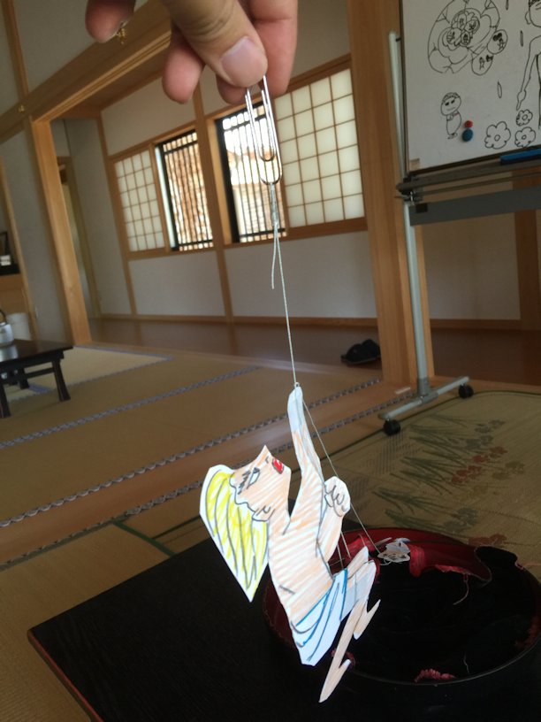 最後は磁石のついた糸を強く引っ張ると、カンダタたちがひらひらと舞い落ちる仕掛けになっております。